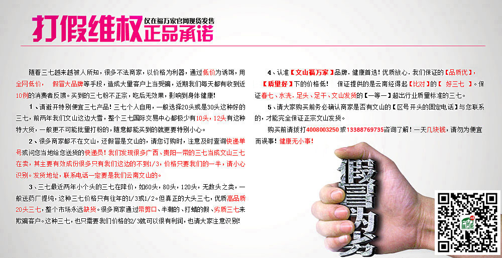 100%正宗文山三七,品質(zhì)保障,假一賠十;服務(wù)熱線:15969298895 推廣技術(shù)支持:文山康萬家農(nóng)業(yè)發(fā)展有限公司 福萬家 版權(quán)所有:福萬家 微信fuwanjia37